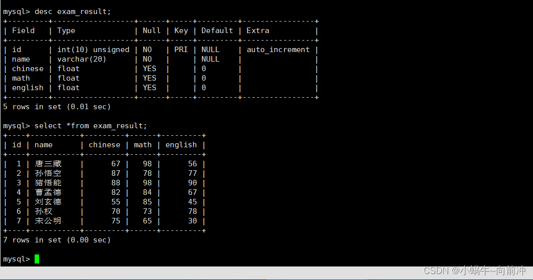 chinese float DEFAULT 0.0 COMMENT '语文成绩',