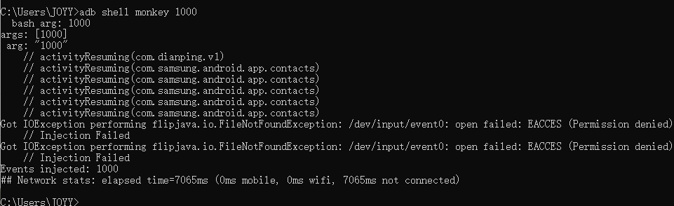 如果应用崩溃或收到任何未处理的异常,Monkey 会停止并报告错误。