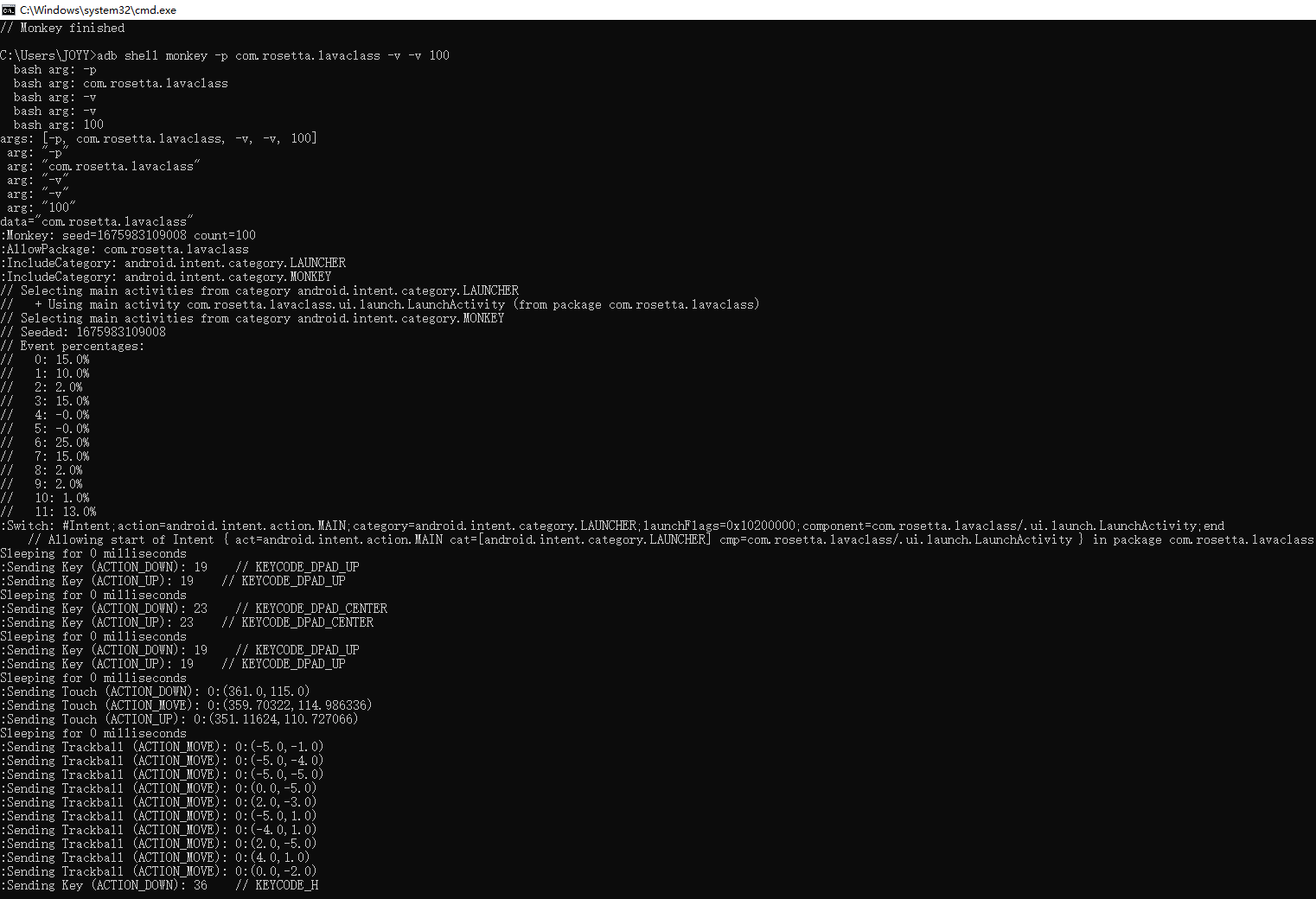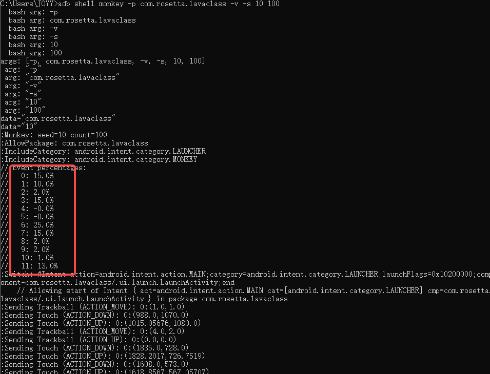 Monkey的事件类型总共有11种,分别是触摸(Touch)、手势(motion)、二指缩放(pinchzoom)、轨迹(trackball)、旋转(rotation)、基本导航(nav)、主要导航事件(majornav)、系统按键(syskeys)、启动activity(appswitch)、键盘事件(flip)和其它类型事件(anyevent),在日志中分别用0-10来表示,若要对此进行设置,则在对应英文前加--pct-xxx放入命令行;如果不指定事件的百分比,Monkey会随机按事件百分比来跑APP;