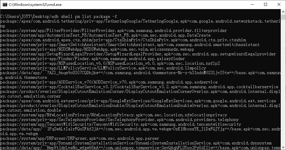 adb shell pm list package -f