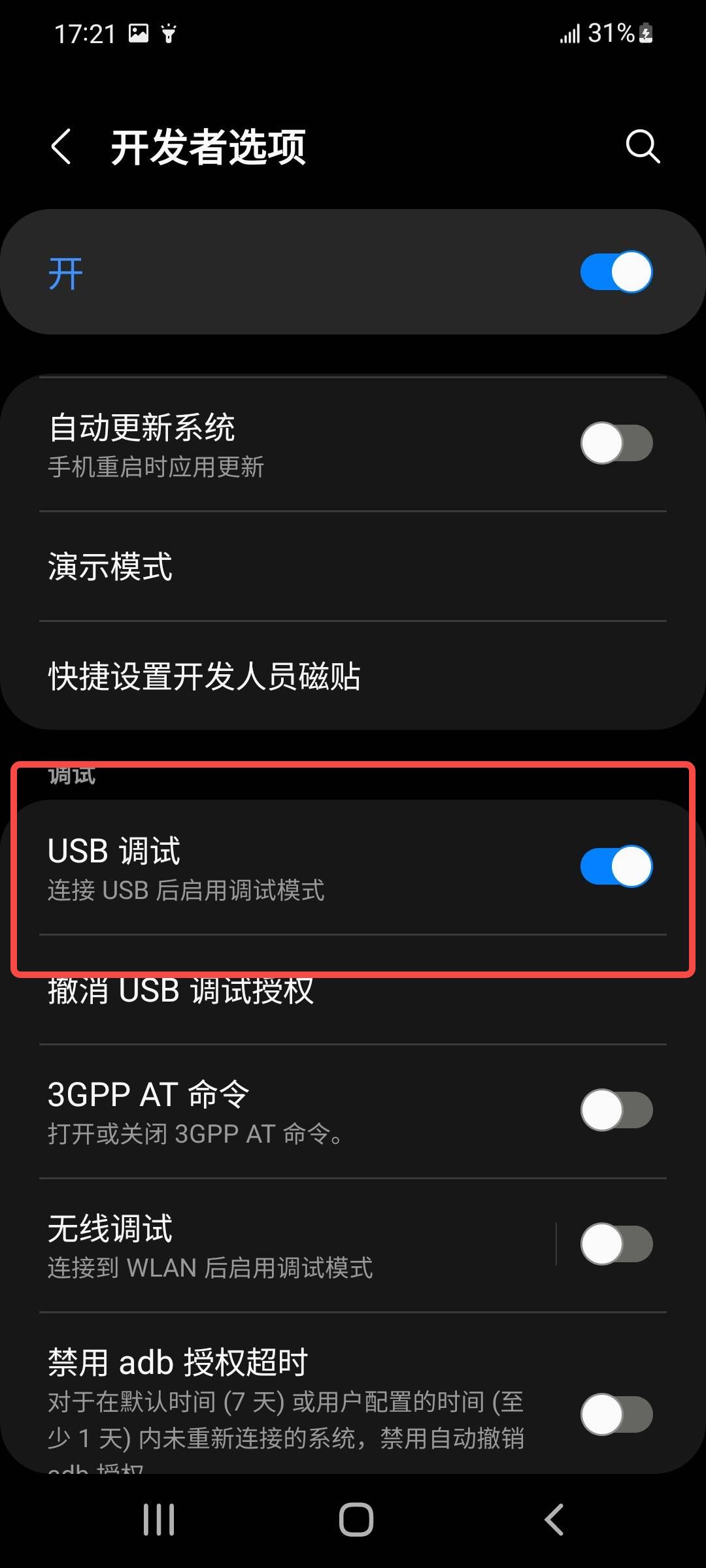 选择好我们的设备以后,我们进行手机的Type-C端口与PC数据端口使用数据线进行数据连接,并打开开发者工具中的USB调试口(这里三星为例:入口在:设置->开发者选项->Usb调试)