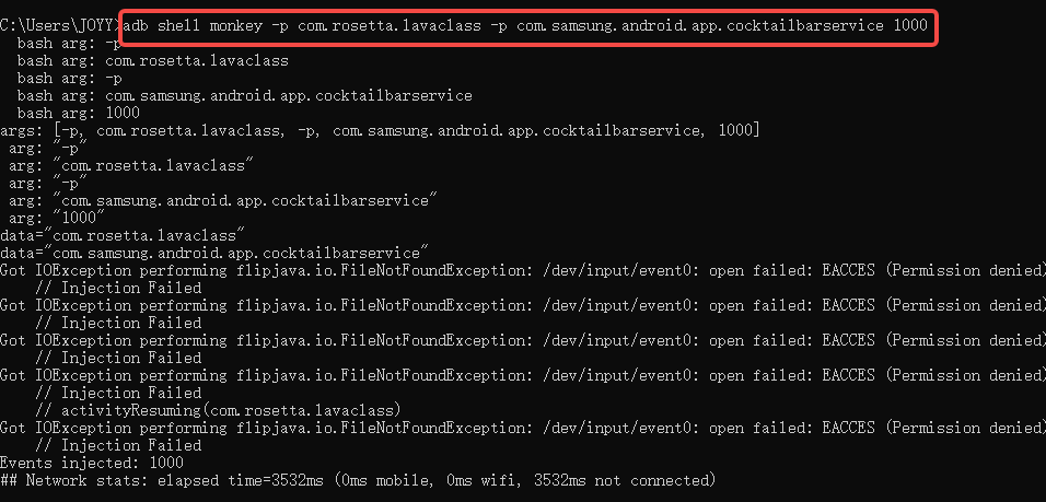 adb shell monkey -p com.xxx.xxx --ignore-security-exceptions 1000