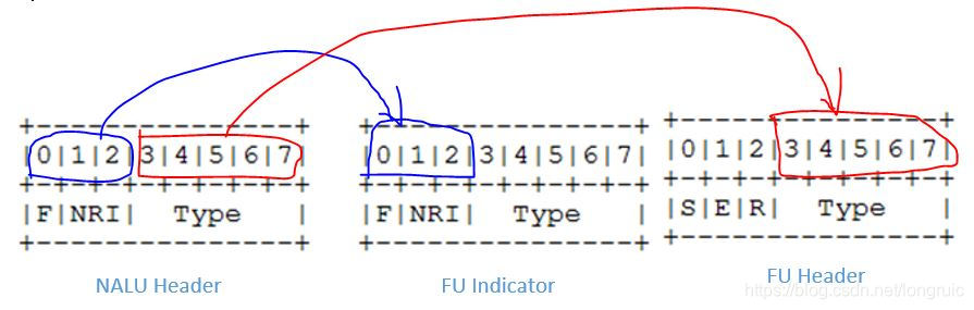 1. 这里没有NALU头了,如何判断类型?实际上NALU头被分散填充到FU indicator和FU header里面了,bit位按照从左到右编号0-7来算,nalu头中0-2前三个bit放在FU indicator的0-2前三个bit中,后3-7五个bit放入FU header的后3-7五个中