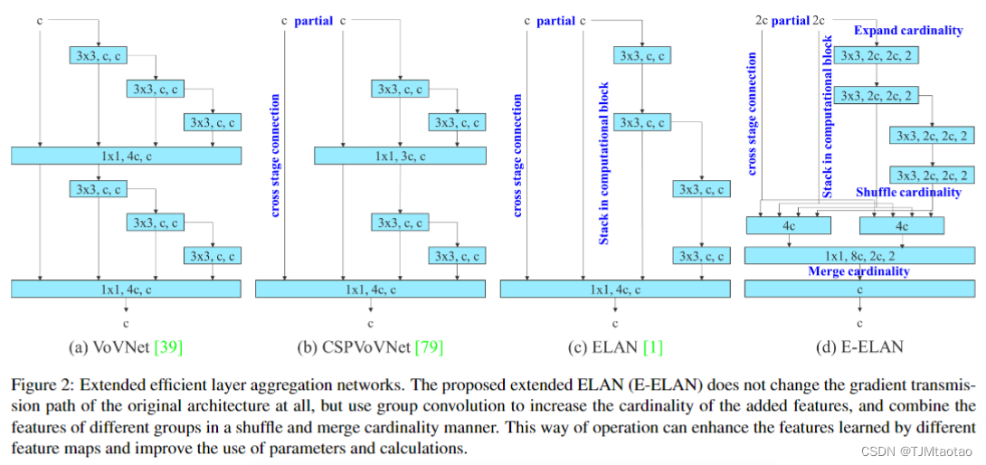 在大多数关于设计高效架构的文献中,主要考虑的无非是参数的数量、计算量和计算密度。Ma等[55]还从内存访问代价的特点出发,分析了输入/输出信道比、体系结构分支数量和单元操作对网络推理速度的影响。Dolĺar等[15]在执行模型缩放时还考虑了激活,即更多地考虑卷积层输出张量中的元素数量。图2 (b)中的CSPVoVNet[79]设计是VoVNet[39]的变体。CSPVoVNet的架构[79]除了考虑上述的基本设计问题外,还对梯度路径进行了分析,使不同层的权值能够学习到更多样化的特征。上述梯度分析方法使得推断更快、更准确。图2 (c)中的ELAN[1]考虑了以下设计策略——“如何设计一个高效的网络?”他们得出结论:通过控制最短最长梯度路径,深度网络可以有效学习和收敛。在本文中,我们提出了基于ELAN的Extended-ELAN (E-ELAN),其主要架构如图2 (d)所示。