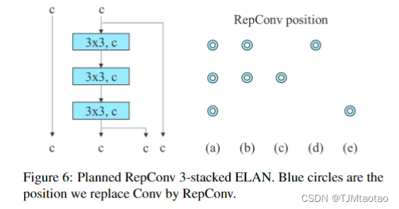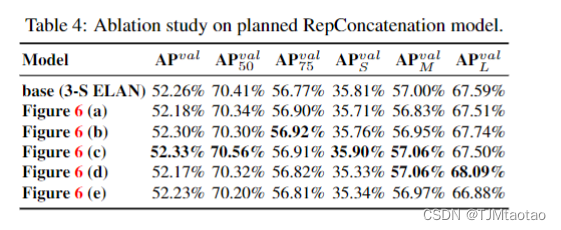 在基于级联的模型实验中,我们将3层叠加ELAN中不同位置的3 × 3卷积层替换为RepConv,具体配置如图6所示。从表4所示的结果中,我们看到所有较高的AP值都出现在我们提议的重新参数化的模型中。