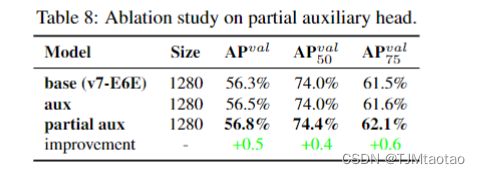 由于提出的YOLOv7使用多个金字塔来共同预测目标检测结果,我们可以直接将辅助头部连接到中间层的金字塔进行训练。这种类型的训练可以弥补在下一级金字塔预测中可能丢失的信息。基于上述原因,我们在提出的E-ELAN架构中设计了部分辅助头。我们的方法是在合并基数之前在一组特征映射后连接辅助头,这种连接可以使新生成的特征映射集的权值不被辅助损失直接更新。我们的设计允许每个铅头金字塔仍然从不同大小的物体中获取信息。表8显示了两种不同方法的结果,即粗到细铅引导和部分粗到细铅引导。显然,部分粗转细导法具有较好的辅助效果。