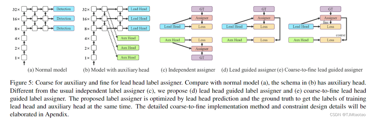 图5:粗的辅助和细的铅头标签分配器。与正常模型(a)相比,(b)中的模式有辅助头部。不同于通常的独立标签分配器(c),我们提出(d)铅头引导标签分配器和(e)粗到细铅头引导标签分配器。利用导联头预测和地面真实值优化标签分配器,同时获得训练导联头和辅助导联头的标签。详细的从粗到细的实现方法和约束设计细节将在附录中详细阐述。