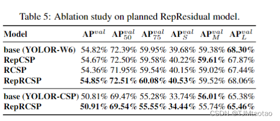 为了验证所提出的平面再参数化模型的通用性,我们分别将其应用于基于串联的模型和基于残差的模型上进行验证。我们选择的基于级联的模型和基于残差的模型分别是3层的ELAN和CSPDarknet。