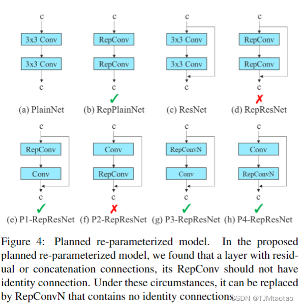 图4:规划的重新参数化模型。在提出的重新参数化规划模型中,我们发现有残留连接或串联连接的层,其RepConv不应该有标识连接。在这种情况下,它可以被不包含身份连接的RepConvN替换。