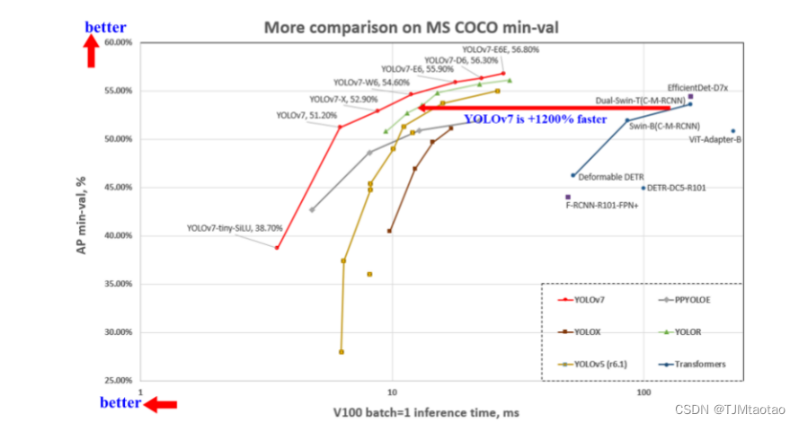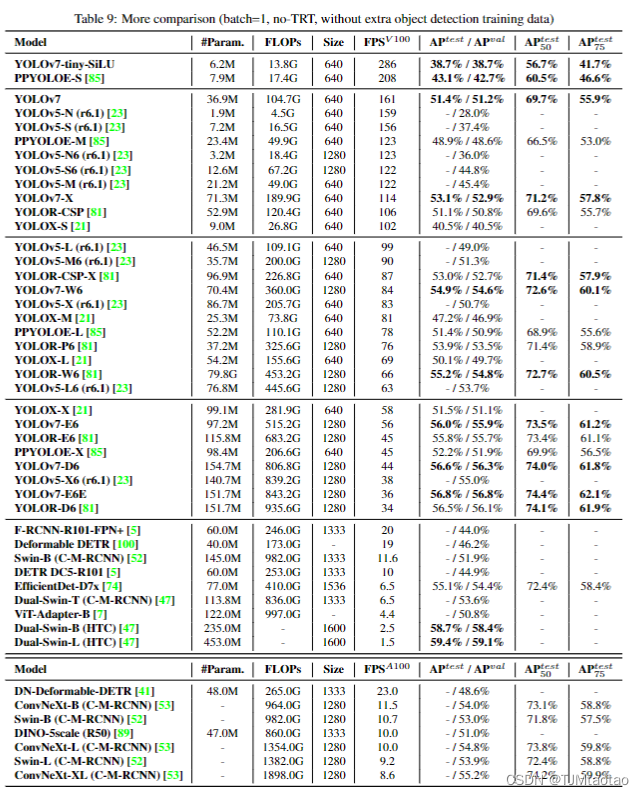 YOLOv7在5 FPS到160 FPS的范围内,在速度和精度上都超过了所有已知的物体检测器,在GPU V100上以30 FPS或更高的速度在所有已知的实时物体检测器中具有最高的精度56.8% AP。YOLOv7-E6对象检测器(56 FPS V100,55.9% AP)的速度和精度分别比基于变压器的检测器SWINL Cascade-Mask R-CNN(9.2 FPS A100,53.9% AP)快509%和2%,比基于卷积的检测器conv next-XL Cascade-Mask R-CNN(8.6 FPS A100,55.2% AP)快551%和0.7% AP,YOLOv7的性能也更好此外,我们仅在MS COCO数据集上从头开始训练YOLOv7,而不使用任何其他数据集或预训练的权重。源代码发布在 https:// github.com/ WongKinYiu/ yolov7。