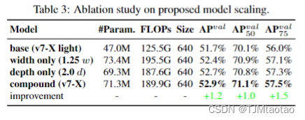 表3显示了使用不同模型缩放策略进行缩放时的结果。其中,我们提出的复合缩放方法是将计算块的深度放大1.5倍,将过渡块的宽度放大1.25倍。与仅扩大宽度的方法相比,该方法在参数较少、计算量较少的情况下,可使AP提高0.5%。如果将我们的方法与只增加深度的方法进行比较,我们的方法只需要增加2.9%的参数数和1.2%的计算量,可以提高AP的0.2%。从表3的结果可以看出,我们提出的复合缩放策略可以更有效地利用参数和计算。