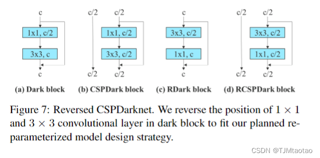 在基于残差模型的实验中,由于原始的黑暗块没有一个符合我们设计策略的3 × 3卷积块,所以我们为实验额外设计了一个反向的黑暗块,其架构如图7所示。由于带有暗块和反向暗块的CSPDarknet具有完全相同的参数和操作量,所以比较是公平的。表5所示的实验结果充分证明了所提出的重新参数化模型对基于残差的模型同样有效。我们发现RepCSPResNet[85]的设计也符合我们的设计模式。