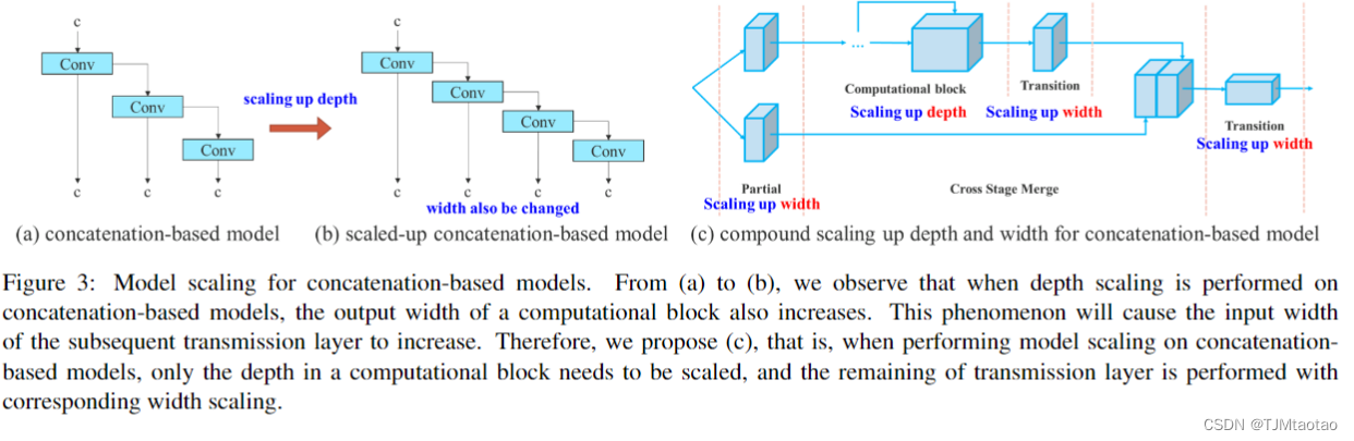 图3:基于连接的模型的模型扩展。从(a)到(b),我们观察到当对基于级联的模型进行深度缩放时,计算块的输出宽度也会增加。这种现象会导致后续传输层的输入宽度增大。因此,我们提出(c),即对基于级联的模型进行模型缩放时,只需要对计算块中的深度进行缩放,其余的传输层进行相应的宽度缩放。