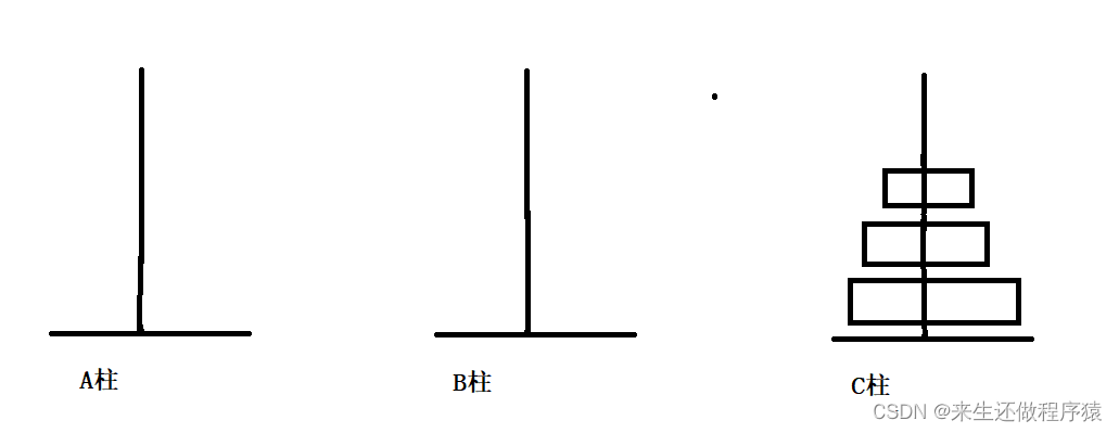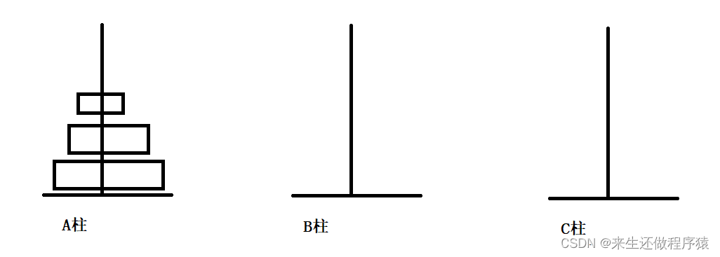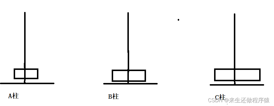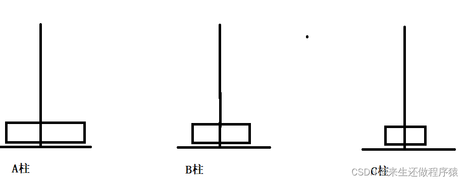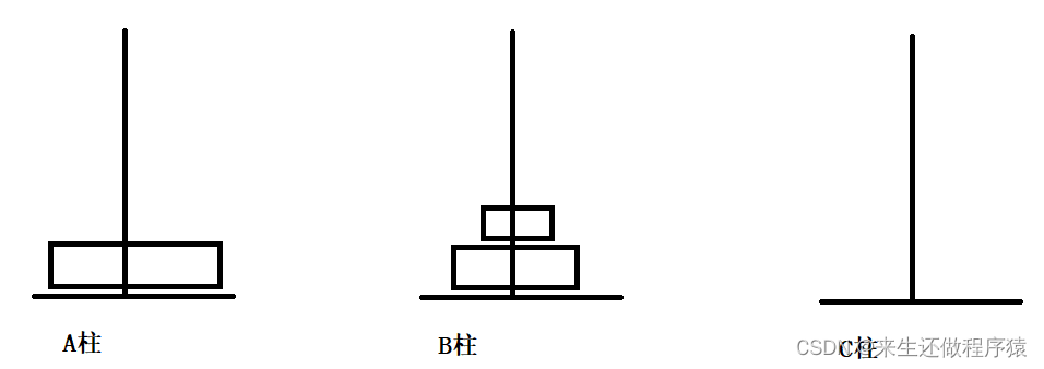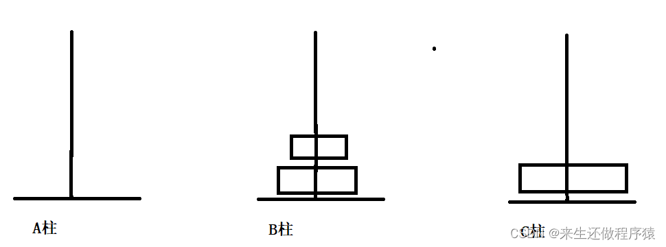 (二)、如果有俩个圆盘的情况下,先将A柱最上面的圆盘移动到B盘,再将A柱上的最后一个圆盘移动到C柱,最后将B柱上的圆盘,移动到C柱