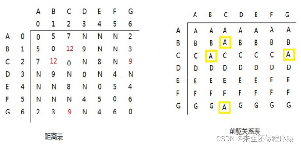 假设 将A作为中间顶点情况有 1. C-A-G [9] 2. C-A-B [12] 3. G-A-B [7]。更新距离表和前驱关系表、。无向图,不考虑G-A-C。