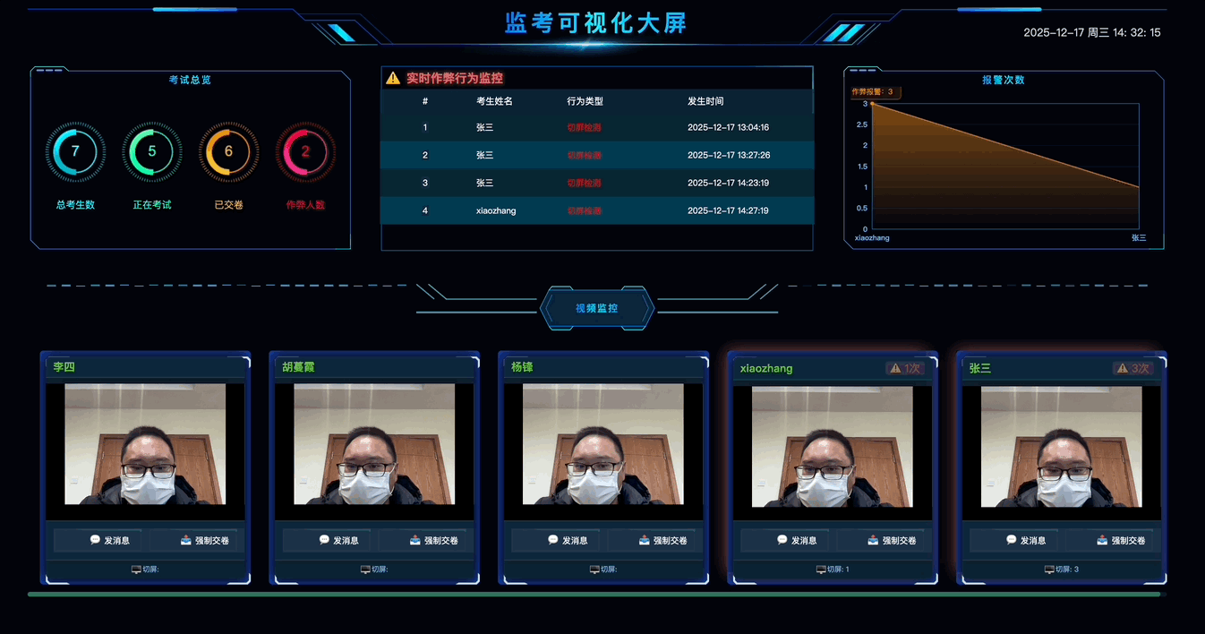 3.切屏后强制交卷:切屏时间的次数配置,考生最小化窗口、分屏、切换到其他页面等行为都会判定为分屏,超过配置等次数后就会被系统强制交卷。