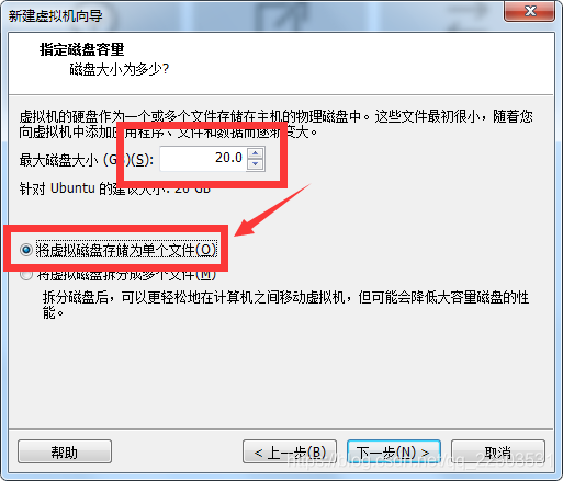 分配磁盘容量20G ,重要重要:选择【将虚拟磁盘存储为单个文件(O)】,点击下一步。