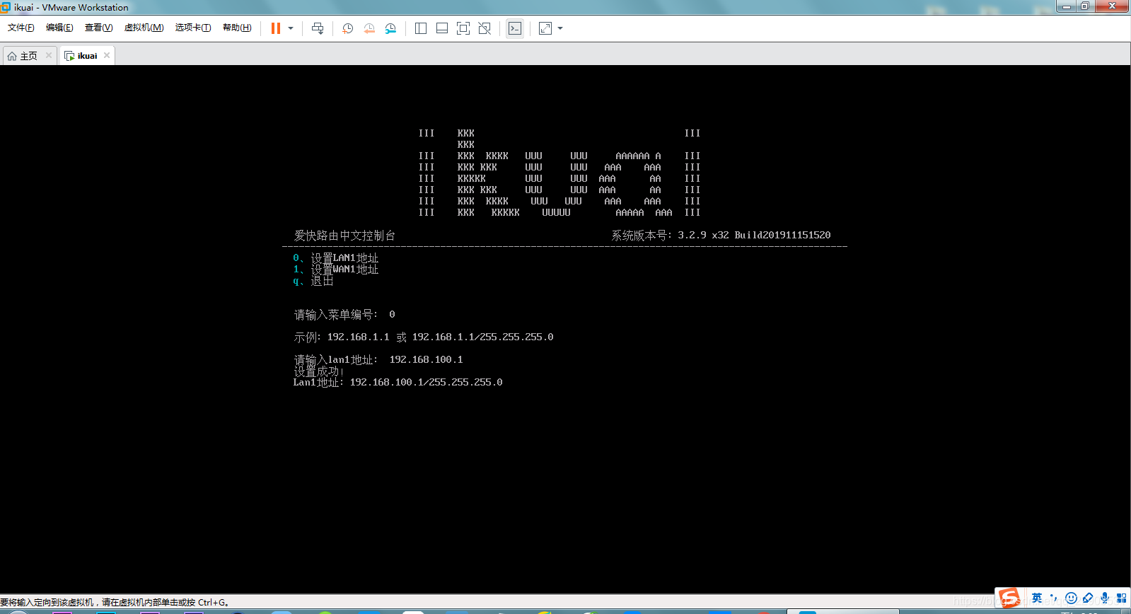 请输入菜单编号:2 选择0:设置LAN1地址。回车,出现:请输入lan1地址:192.168.100.1 回车设置完成