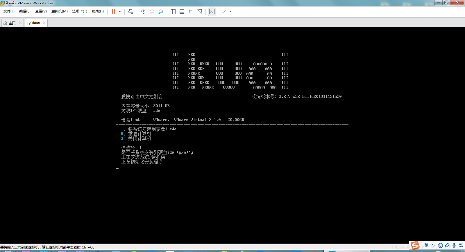 安装爱快ikuai系统后,请选择:1 是否安装系统选择 y 然后按 回车。
