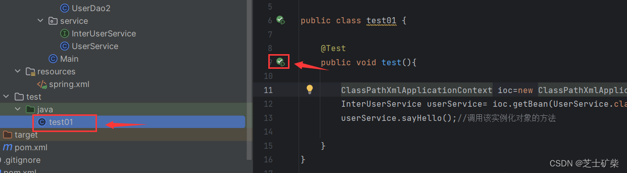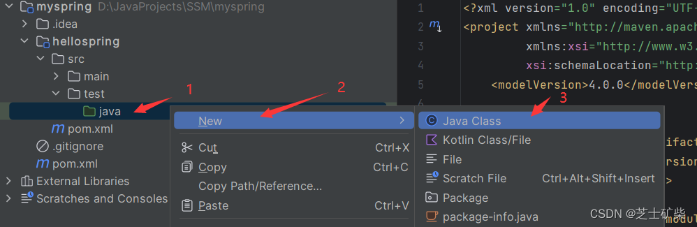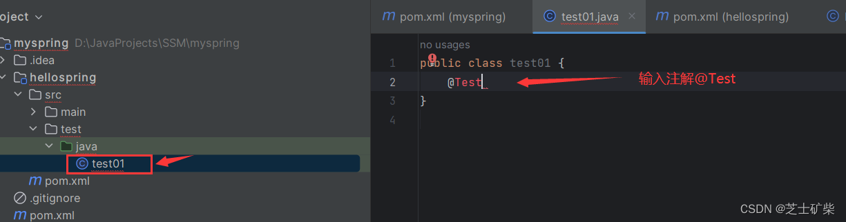 在hellospring模块的test文件夹下,创建一个用于测试的类
