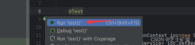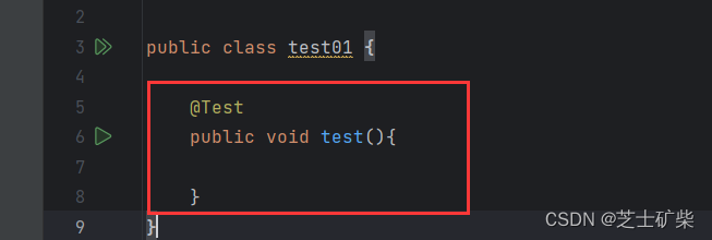 由于@Test注解必须要用在一个方法上,所以我们要在其下创建一个方法,该方法会用于之后的测试