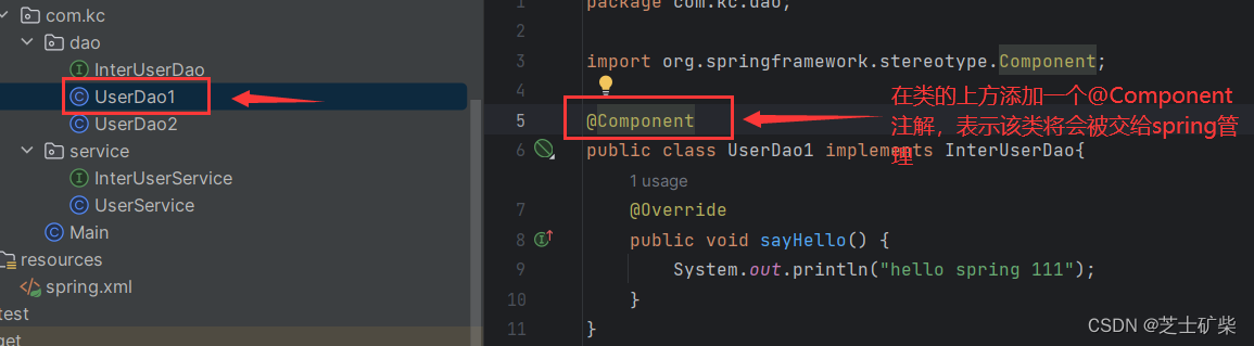 <bean class="com.kc.dao.UserDao1" name="userDao1"></bean><!--将UserDao1的对象配置成bean-->