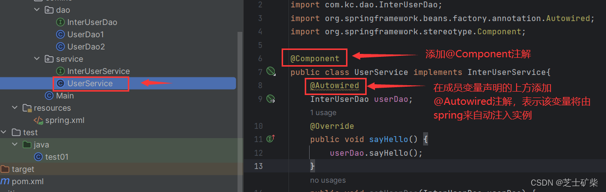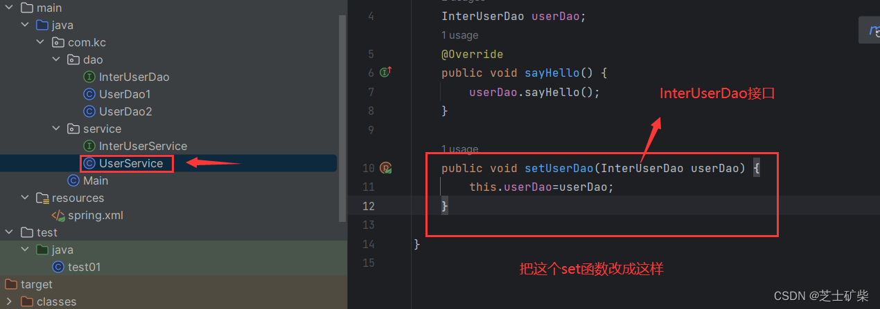 InterUserDao userDao;//将接口InterUserDao的实现类作为成员变量,以实现依赖