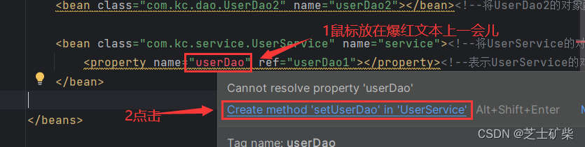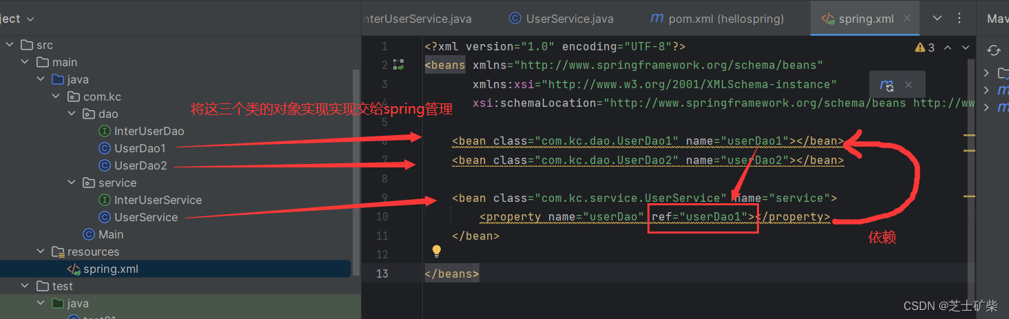 <property name="userDao" ref="userDao1"></property><!--表示UserService的对象依赖于UserDao1对象,即告诉spring在UserService类中会用到UserDao1类型的成员变量,是spring注入的依据-->