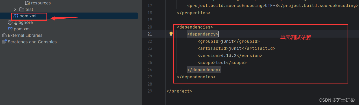 添加后,你会在该模块的pom.xml文件下发现多了一个junit依赖,如下图