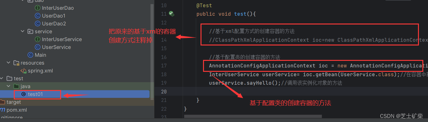 这个方式完全舍弃了对xml的配置,把原来xml文件的工作交给一个类来完成,所以这个类也被叫做配置类