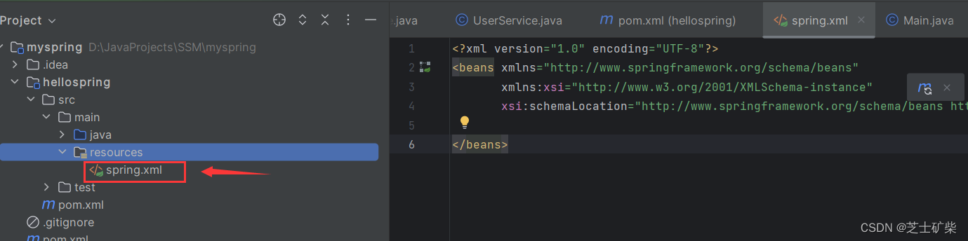 代码:(这里注意一下class路径要根据自己的类路径来,name可以自定义,这里ref表示UserService依赖对象的name,可以通过修改,改变其依赖)