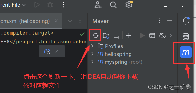 如果你会发现报红,这说明你的依赖库中没有该依赖,但不用慌,点击右侧的m标志,点击刷新按钮