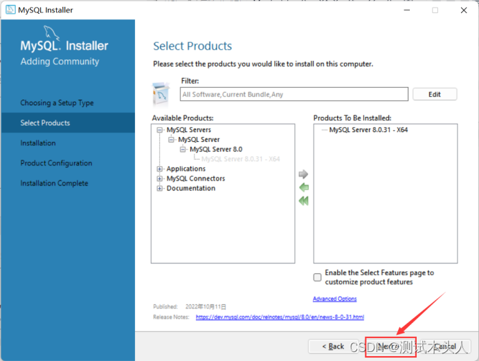 依次点开“MySQL Servers”、“MySQL Servers”、“MySQL Servers 8.0.31”、“MySQL Servers 5.7.31 -64”,然后点击绿色箭头将选中的版本移植到右边选中框中。