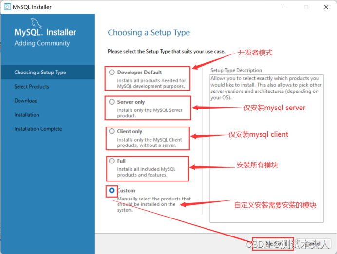 1.出现如下这个界面后,选择"Custom",,点击"Next"。