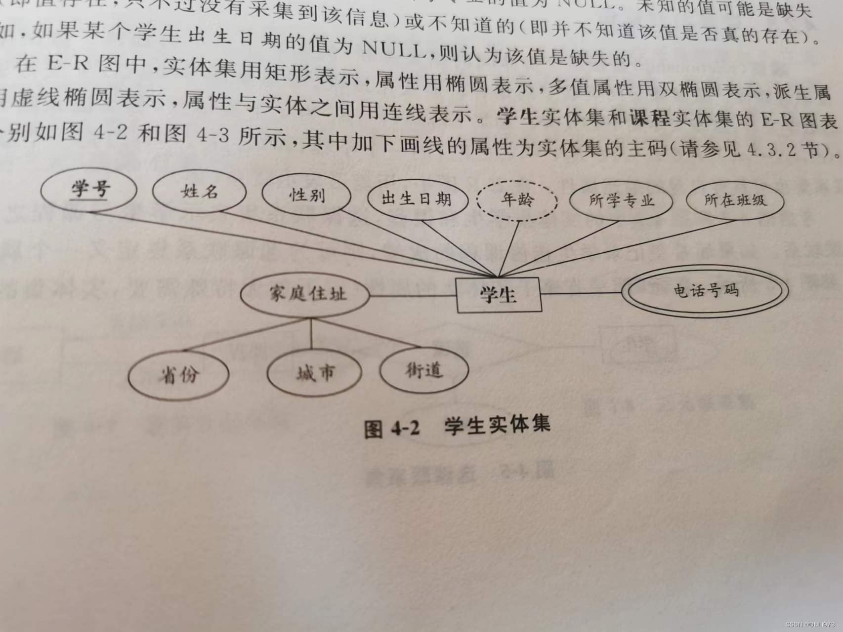 如果某属性的值可以从其他相关联属性或实体派生出来,则该属性为派生属性(学生的年龄,为当前日期和出生日期的值计算得到)