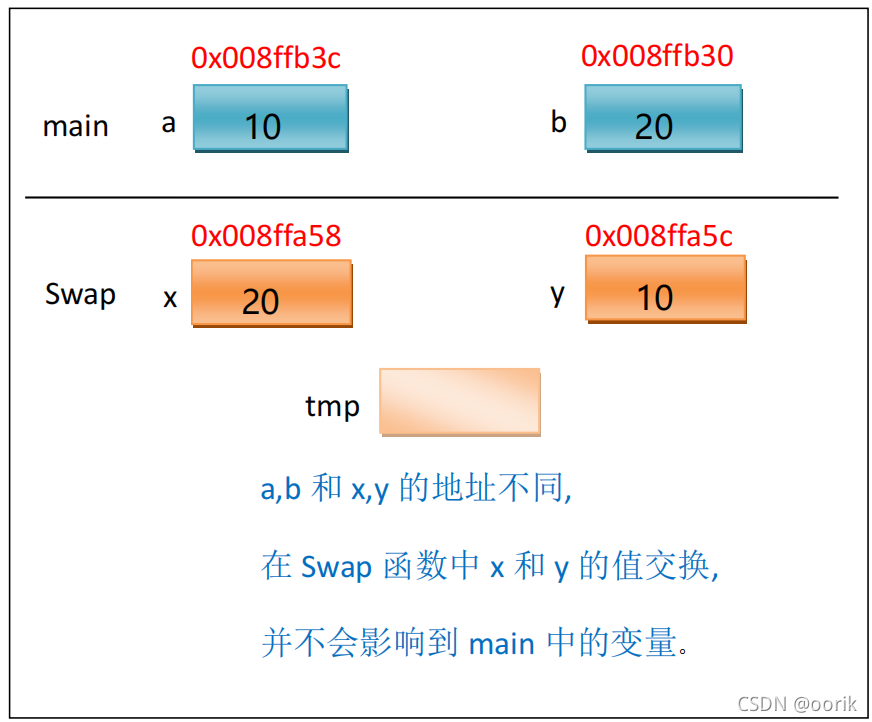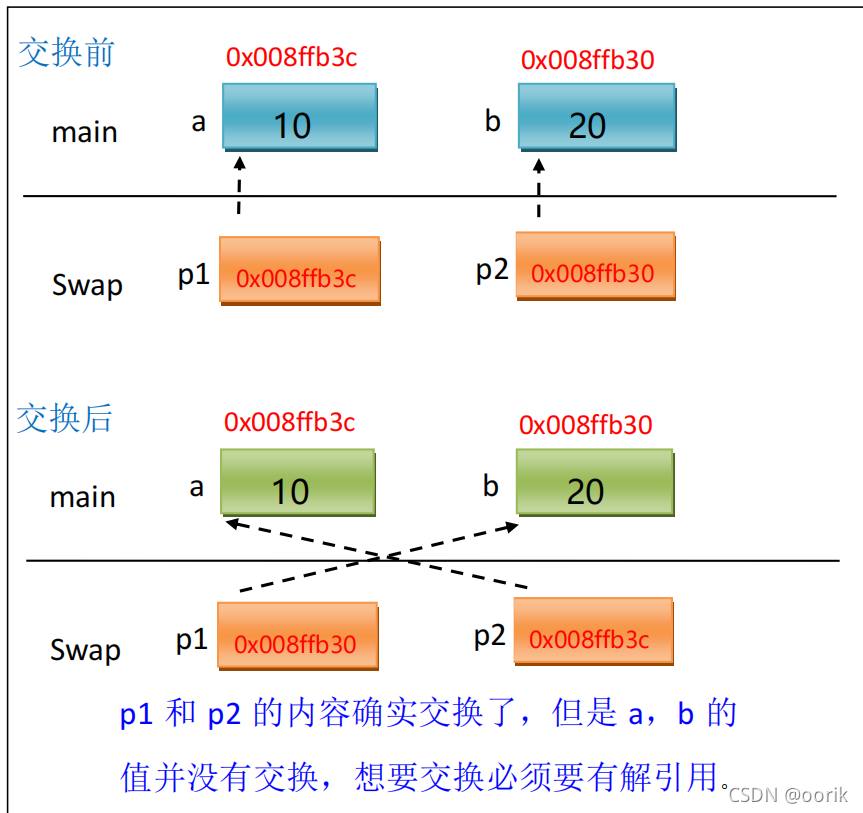 如果想在 Swap 函数中修改 main 中 a,b 的值,必须突破不同函数间的限制,而
