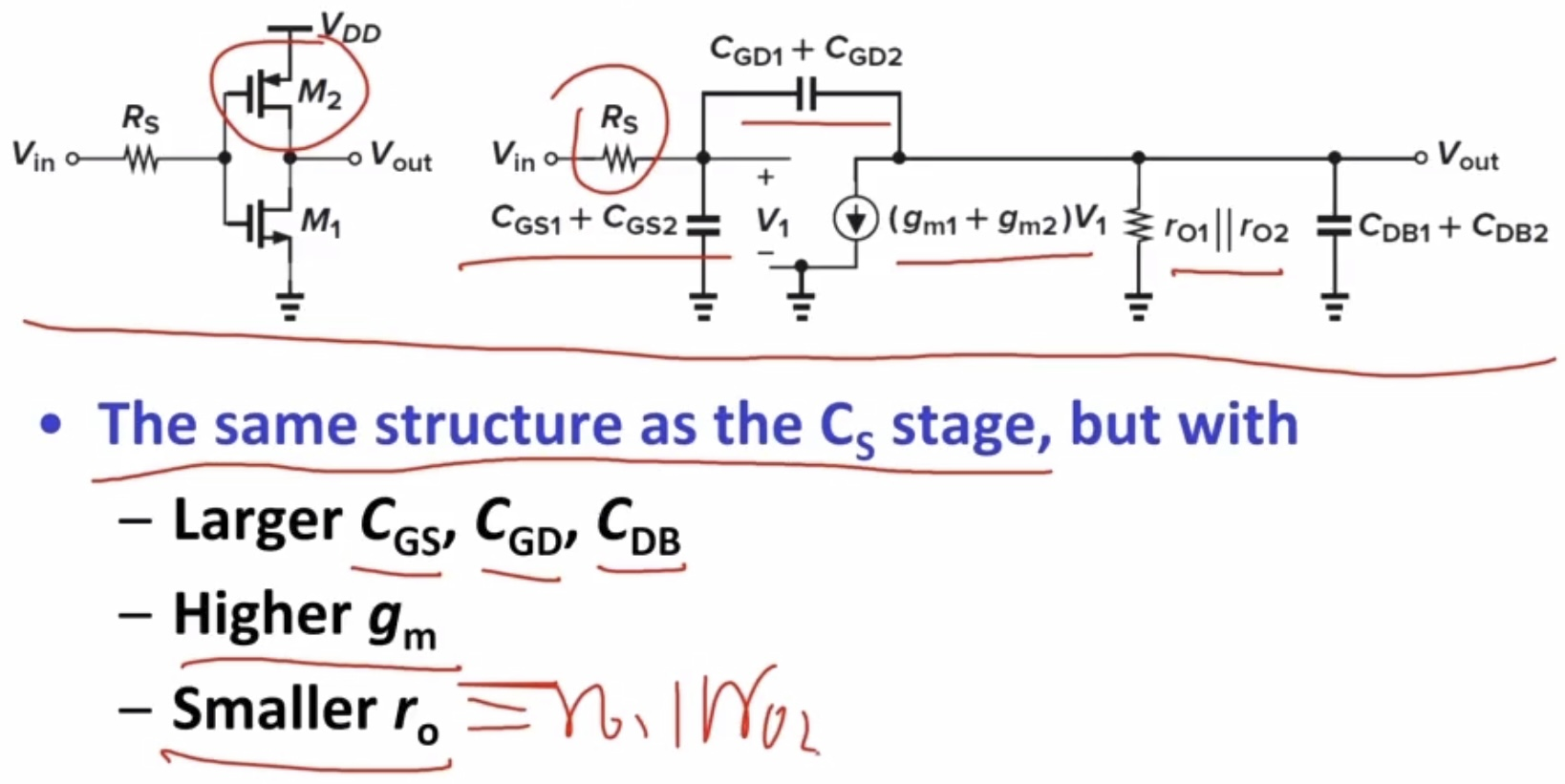 Miller’s approximation:用低频时的增益分析高频。缺点:可能消除了传递函数的zeros、预测额外的poles、不能正确计算输出阻抗。