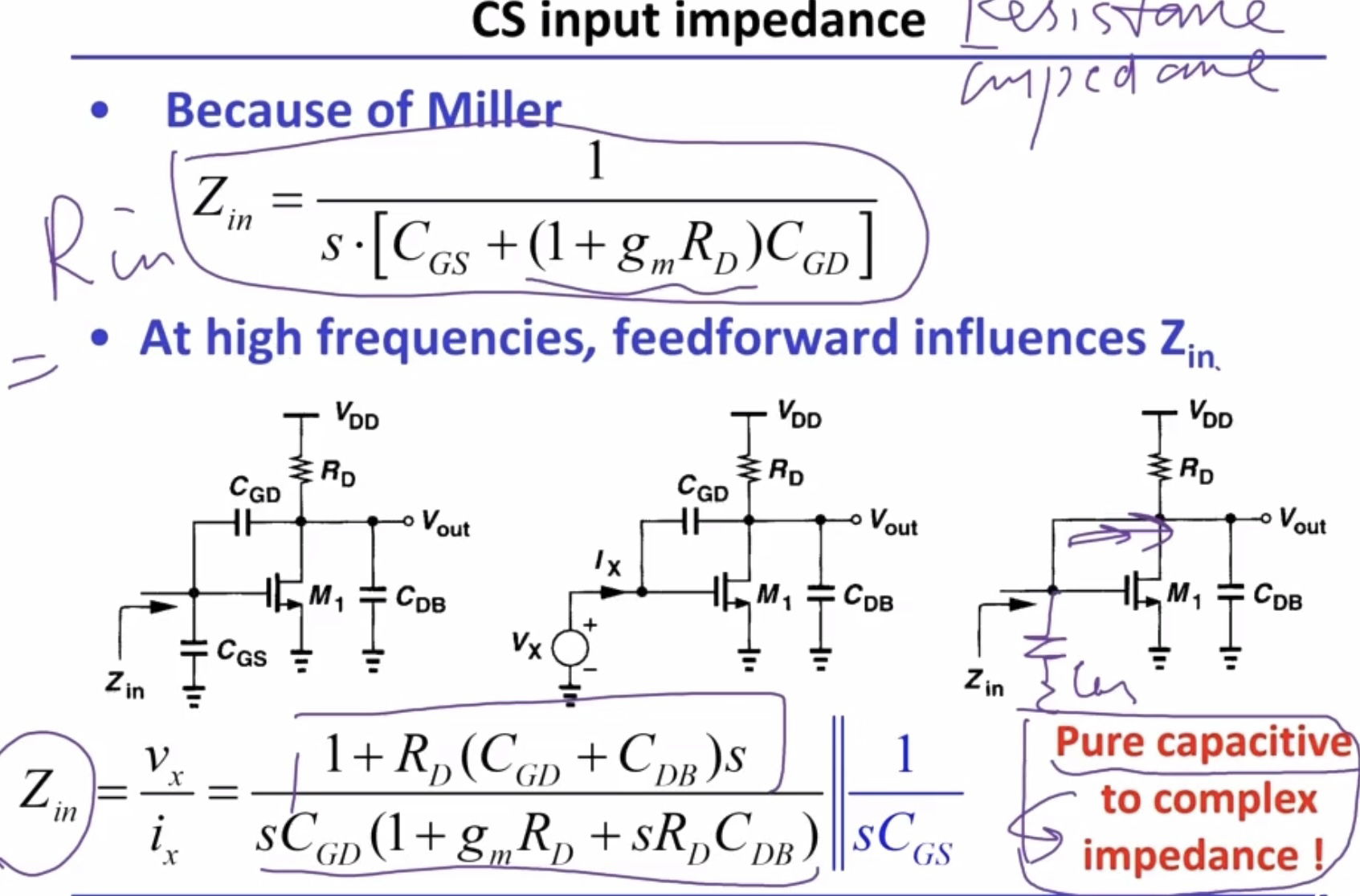 - CS输入容性阻抗(resistance是impededance的实部):高频时,存在输入电流。前馈影响了输入阻抗,不再是单纯的容抗,而是复阻抗。