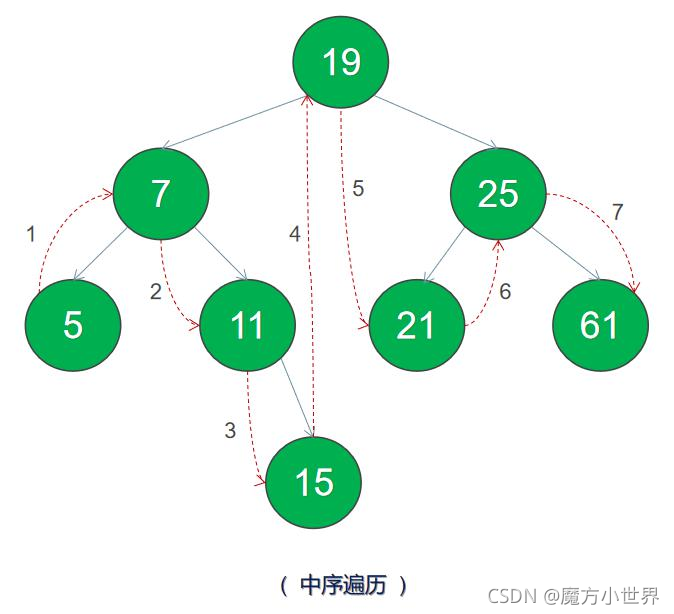 中序遍历结果: 5 7 11 15 19 21 25 61