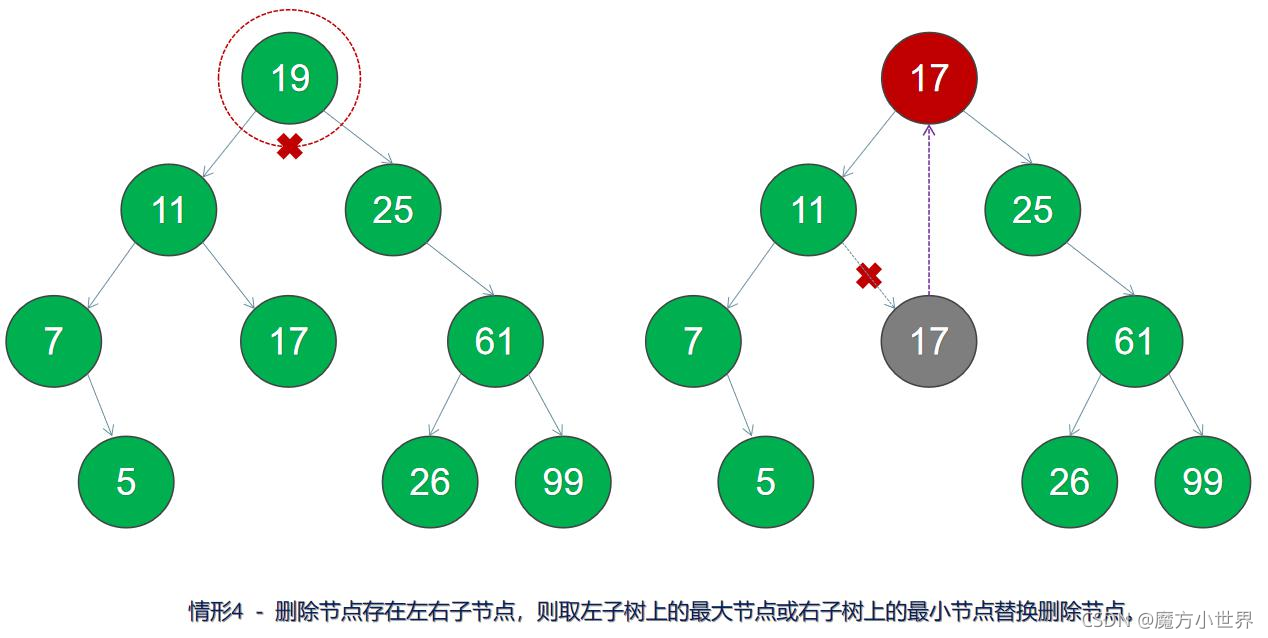 4.删除节点存在左右子节点,则取左子树上的最大节点或右子树上的最小节点替换删除节点。