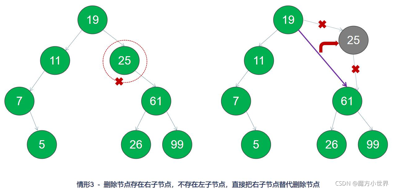 3.删除节点存在右子节点,不存在左子节点,直接把右子节点替代删除节点