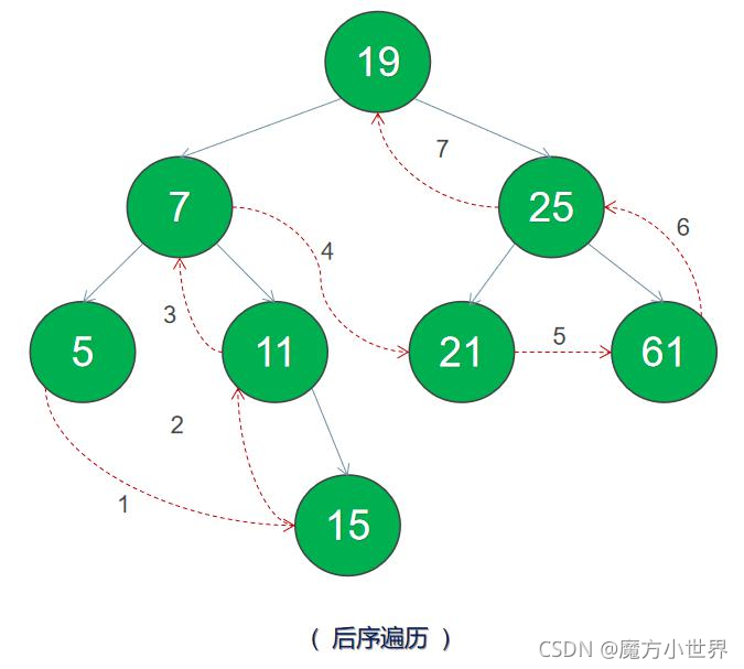 后序遍历结果: 5 15 11 7 21 61 25 19