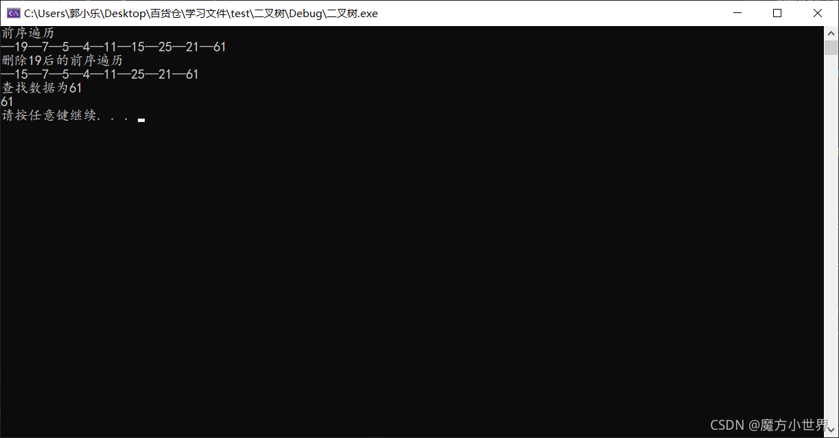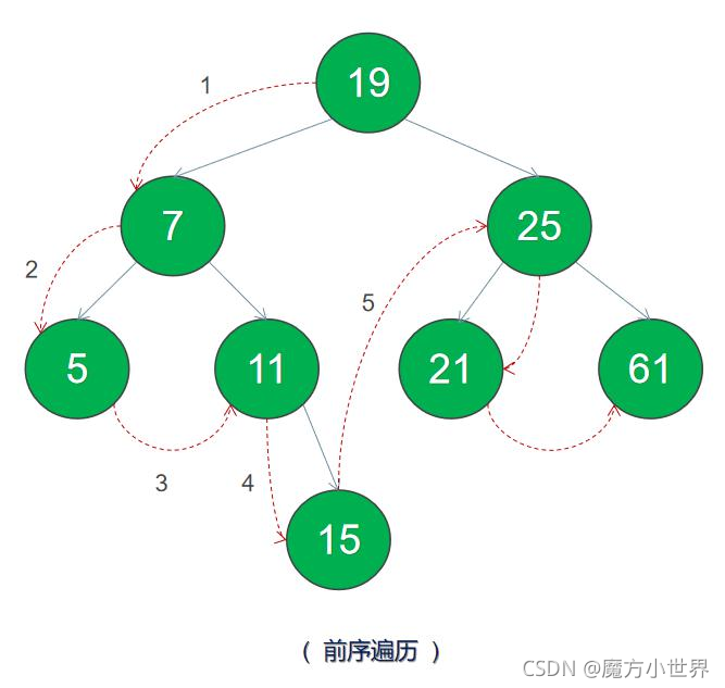上图前序遍历结果: 19 7 5 11 15 25 21 61