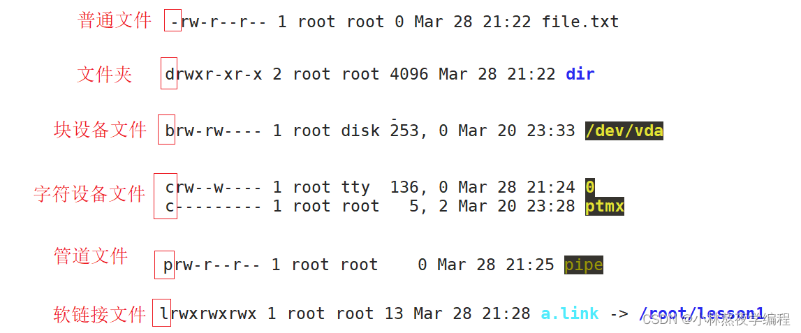 Linux中通过文件属性的第一位区分文件类型。常见的文件类型如下,此处我们通过命令来进一步验证。