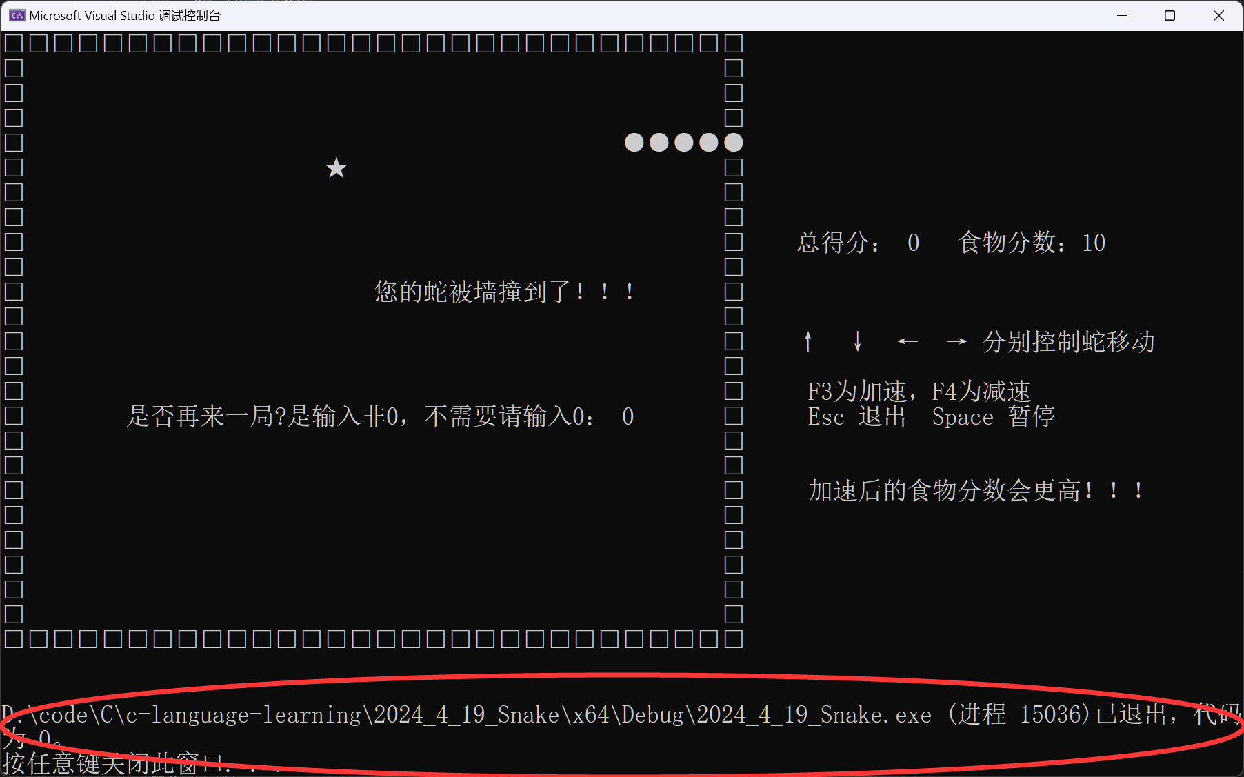 如果你不想写,我们可以美化一下游戏,把程序的终止信息打印在最下面,需要设置一下光标位置,所以最后我还写了一行光标的定位代码。