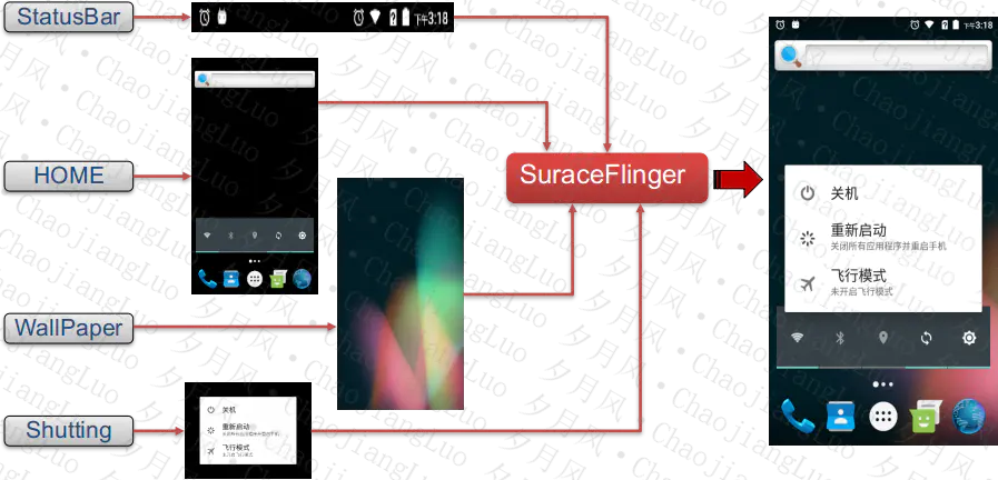 从上图,我们可以看出,在长按Power键,弹出关机对话框时,有4层Layer,可以立即为有4个窗口。4个窗口经过SurfaceFlinger进行合成后,再送到显示器进行显示。