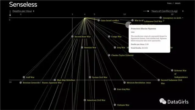 其中,点代表若干主要战役。悬停在这些点上,可以提供一些关于战役的简要信息,以及每小时的死亡人数和总死亡人数。根据您想查看信息的方式,可以用几种不同的方式组织图表。