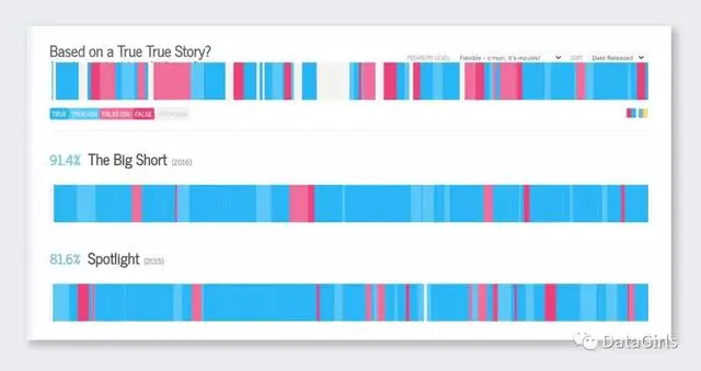 可视化聚焦于一些不同的“根据真实故事改编”的电影,并为电影的不同部分列出了一个不同颜色的条码:深粉色是假的,深蓝色是真实的,稍浅一点(paler)则代表大多是假的或者大部分是真实的。