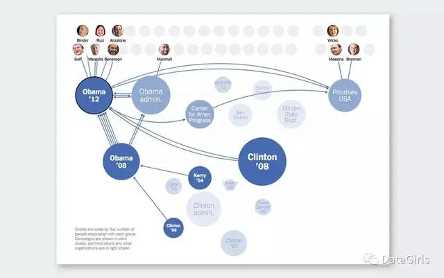 每张可视化包含几个不同大小的圆点,代表特定的竞选活动、行政管理或其他与候选人当前竞选有关的政府组织,然后由箭头连接。当悬停在某个特定的点上,团体之间的关系就被高亮出来。