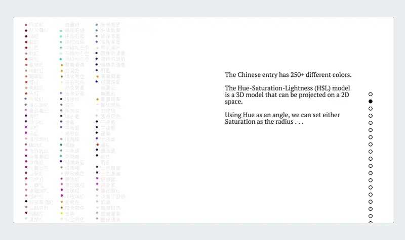 这项可视化是一个网页空间。当鼠标向下滚动时,文本会发生变化,就像许多颜色点在白色背景上移动一样。这些圆点不仅代表了每种颜色的色调,而且代表了每个类别的数量,例如,在中文和英文中最流行的“底色”是哪个。